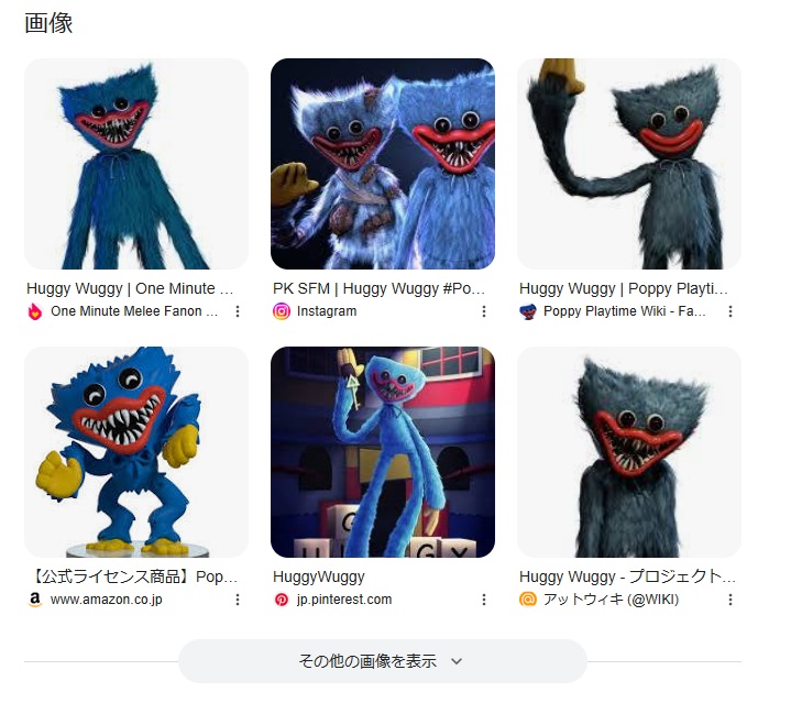 先日、断片的に聞いた話。 幼稚園のバスの中で、幼稚園生の間で流行っているものというものを聞いたんだそうだ。 ・顔がハート ん?新しいプリキュアかなんかかな。 ・赤とか青の色が付いている 戦隊ものかな? ・抱きしめちゃうの ん?人形? ・トゲトゲの歯が付いている ん? モンスターみたいなの? モンスターズインクとか、セサミストリートみたいな? ・モンスターとは違うんだよ へ? 「HuggyWuggy(ハギー・ワギー)」という、ホラーゲームに登場するキャラクターの事らしいです。 で、なんで幼稚園生の間で流行っているの? ってか、モンスターにしか見えないんだけどなぁ。 ![]() 目次の表示: ブログではないので、コメント機能とトラックバック機能は提供していません。ご質問・ご意見等はメール、フィードバックまたはTwitter等からお願いします。いただいたご質問・ご意見などは、この「管理人のひとこと」の記事に追加、あるいは新規の記事にする形で一部または全文をそのまま、あるいは加工させていただいた上で、ご紹介させていただく場合があります。 当サイトでは掲載内容による不具合等に関する責任を持ちません。また、内容の正確性についての保証もありませんので、情報をご利用の際は、利用者の自己責任で確認をお願いします。 |