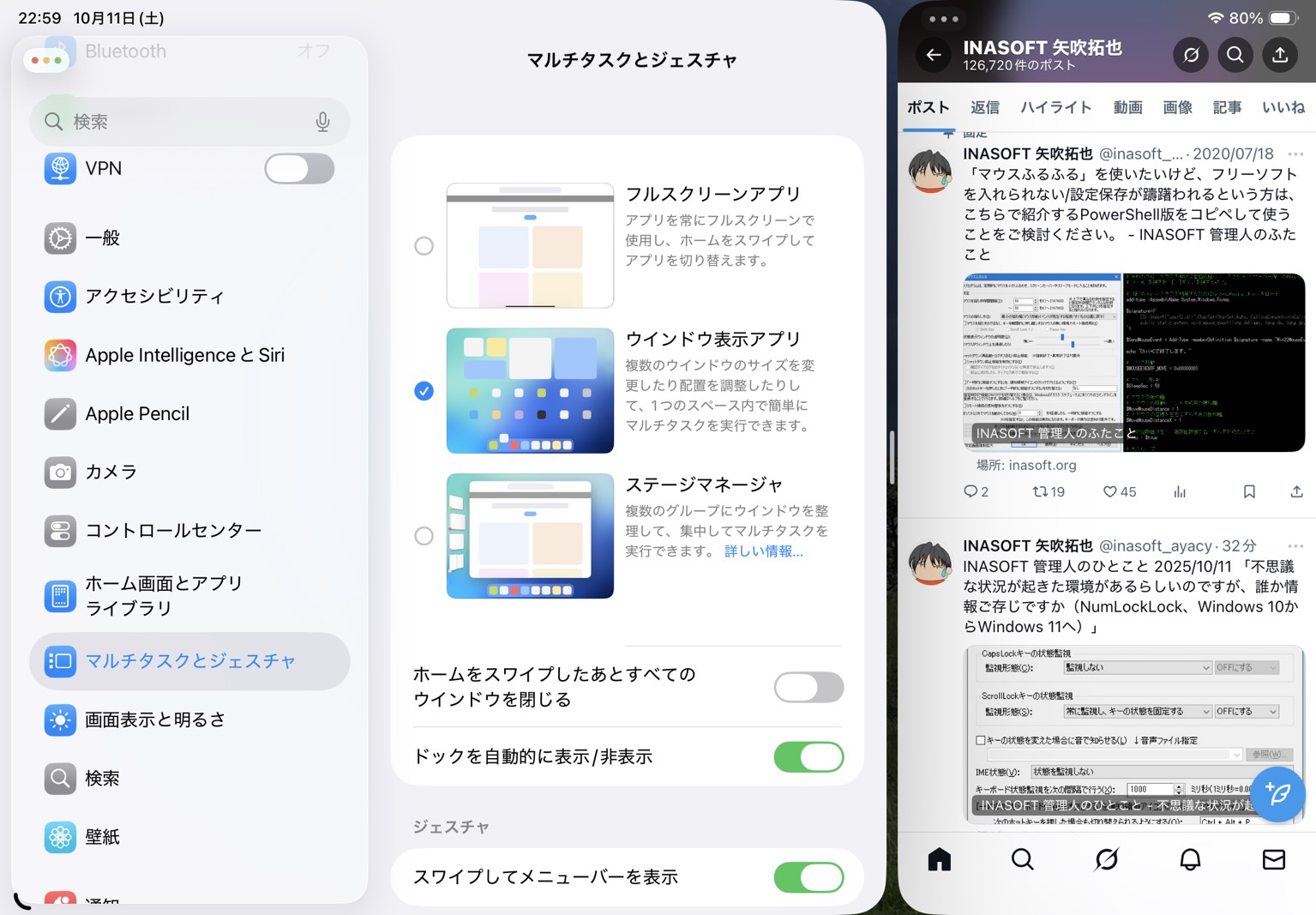 iPad Air(M3)を購入したので、iPadをパソコン的にどこまで使えるかを色々試している(続き)という話を書いたことがありました。 iPadOS自信のマルチタスク機能の話、キーボードやマウスや拡張モニタなどの外部機器をつないだ場合の話、など。 その後、先日公開されたiPadOS26では、かなりMacOS寄りの機能増強が行われました。このアップデートはiPad Air/Proだけでなく、無印iPadにも適用されましたので、かなり大規模うな基本方針転換が行われたということになります。 ![]() ▲設定から「ウィンドウ表示アプリ」を選択可能になっている ![]() ▲これまでのステージマネージャのようにウィンドウを複数重ね合わせることもできるし、疑似的にスプリットビュー的な機能も実現されているし、画面上部からメニューを出したり、左上の信号機(赤:閉じる、黄色:縮小、緑:フル⇔ウィンドウ切替)も使える 残念ながら、スプリットビューとスプリットオーバーの機能が消えてしまいましたが、現在β版のiPadOS 26.1では、スプリットオーバーの機能が復活するという情報もあります。 「ウインドウ表示アプリ」では、複数手順を踏むことで「スプリットビュー」相当の状況へ持ち込むことはできますが、個人的には、これまで通り、少ない手順で「スプリットビュー」の状態に持ち込めていたときの感覚が忘れられず、iPadOS 26(26.0.1)は、ちょっと使いづらいなと思ってしまっています。 まぁ、住めば都といいますし、この「ウインドウ表示アプリ」にも次第に慣れていくかもしれませんし、iPadOS 26.2では「スプリットビュー」が復活してくれるかもしれません。 iPadをパソコンのように使えたら面白いとは思うものの、所詮はタブレット端末ですし、パワー的にはWindowsやMacに及ぶものではないでしょうから、タブレット的な使い方をないがしろにしてほしくはないんですよね。 かつて、Windows 8が、PC的な使い方を見捨てて、タブレット的な使い方を大きく採用し、多くのユーザーからそっぽを向かれてしまった状況と似ている気がします。 拡張的な(PC的な)使い方ができるのはうれしいですが、基本的な使い方の方を見捨てては欲しくないんですよね。 なお、新しいiPadOS 26では、メモアプリやファイルアプリの機能拡張が、かなり濃厚に実施されたという話も聞いていますので、5月ごろに考えていたようなファイル取り扱い機能がどれだけ充実したのか、今後見ていきたいと思います。さりげなく、ここにはかなり期待していますんで。 例えばこの「管理人のひとこと」の編集作業を、すべて、PC作業からiPad作業に移行できたら面白い。 目次の表示: ブログではないので、コメント機能とトラックバック機能は提供していません。ご質問・ご意見等はメール、フィードバックまたはTwitter等からお願いします。いただいたご質問・ご意見などは、この「管理人のひとこと」の記事に追加、あるいは新規の記事にする形で一部または全文をそのまま、あるいは加工させていただいた上で、ご紹介させていただく場合があります。 当サイトでは掲載内容による不具合等に関する責任を持ちません。また、内容の正確性についての保証もありませんので、情報をご利用の際は、利用者の自己責任で確認をお願いします。 |