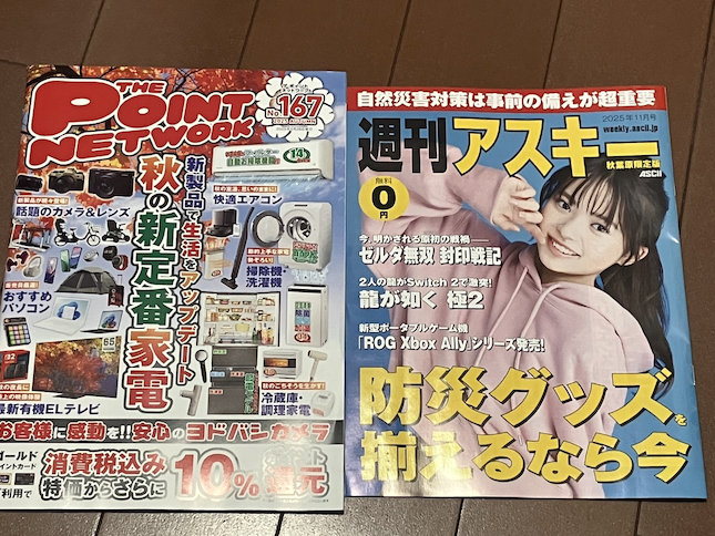小学生の頃に見たMSX BASICの「いってくる!!」をもう一度みたくて買ったときのものですね。 著作権の事とかがあるので、あまり中身の写真を乗せることはできないのですが、当時のPCの宣伝はとても良いです。タモリ氏を起用した富士通のパソコンの広告。少し前に古代祐三氏を起用したPC88の復刻広告(サウンド オブ サイエンス)がありましたが、その広告の元になった武田鉄矢氏を起用したPC88の広告とか。当時は日立もパソコンを作っていましたのでその広告。ナショナル(パナソニック)は、ワープロとパソコンを合わせた「ワーコン」を発売していましたのでその広告。ドルアーガの塔や魔界村の紹介記事。うーん、すばらしい。 で、1985年の雑誌が、40年の時を経て懐かしく思うということですから、そうなると、現在の雑誌を40年後まで保存しておいたら、同じように懐かしく感じるのかもしれません。例えば、0円になってヨドバシアキバで無料配布されている週刊アスキー。