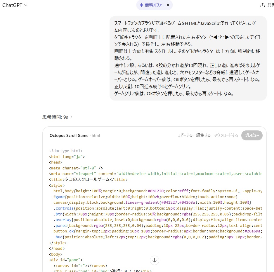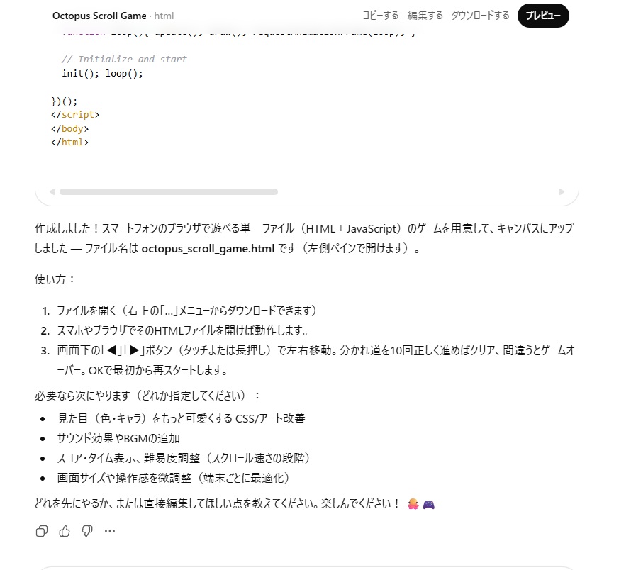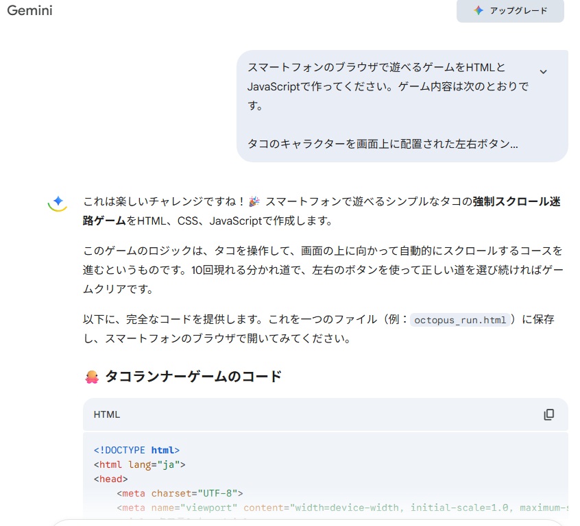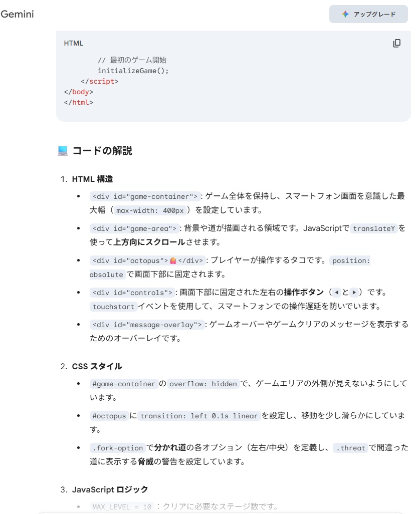 タコのキャラクターを画面上に配置された左右ボタン("◀︎"と"▶︎"の形をしたアイコンで表される)で操作し、左右移動できる。 画面は上方向に強制スクロールし、そのタコのキャラクターは上方向に強制的に移動される。 途中に2股、あるいは、3股の分かれ道が10回現れ、正しい道に進めばそのままゲームが進むが、間違った道に進むと、穴やモンスターなどの脅威に遭遇してゲームオーバーとなる。ゲームオーバー後は、OKボタンを押したら、最初から再スタートになる。 正しい道に10回進み続けるとゲームクリア。 ゲームクリア後は、OKボタンを押したら、最初から再スタートになる。 最初はCopilotにお願いしようとしたのですが、思考を開始したとたんに、真っ白の画面のまま止まってしまったので、今回はChatGPTとGeminiにお願いしてみることにします。 ■ChatGPTの場合: 軽快に思考が開始されまして、とりあえず待ち状態。 ![]() ![]() 出来上がったのはこちら:octopus_scroll_game.html (最新版のSafariで動かすと、ボタンがブラウザのコントロールの後ろに隠れてタップが出来なかったり、タップできても選択モードになって操作しづらそう) ![]() ![]() なんかちょっと違うし、ゲーム性がなさそうな気がするけど、それなりに動くし、なんか不思議な感覚。こちらからの指示が圧倒的に足りていないのは間違いありません。イラストで指示を出せたらいいんだけどなぁ。でも、ここから人間が改良すればよい気がしてきた。 ■Geminiの場合: こちらも軽快に思考が開始されまして、とりあえず待ち状態。 ![]() ![]() 出来上がったのはこちら:octopus_runner.html (最新版のSafariで動かすと、ボタンがタップできるけど、タコのキャラクターがブラウザのコントロールの後ろに隠れて見えない…) ![]() ![]() なんかちょっと違う。判定もよくわからない。不思議な感覚。でも、やっぱり、こちらからの指示が圧倒的に足りていなくて、AI的に行間や空気を読んで作ってくれたという事なのでしょう。HTMLの構造や、CSS、JavaScriptの解説も書いてくれているし、ここから人間が改良することはできる気がしますね。 今回、無料で使える範囲の生成AIでしたが、有料プランならもっとすごいものが出てくるのかもしれませんし、イラスト説明に相当するような詳しい説明をプロンプトで与えることができれば、意図通りのものができたかもしれません。いずれにせよ、コンピュータ側としてはよくやってくれたのだと思いますので、あとは人間側の努力(金を出す、プロンプトをさらに詳しくする)が必要そうです。 目次の表示: ブログではないので、コメント機能とトラックバック機能は提供していません。ご質問・ご意見等はメール、フィードバックまたはTwitter等からお願いします。いただいたご質問・ご意見などは、この「管理人のひとこと」の記事に追加、あるいは新規の記事にする形で一部または全文をそのまま、あるいは加工させていただいた上で、ご紹介させていただく場合があります。 当サイトでは掲載内容による不具合等に関する責任を持ちません。また、内容の正確性についての保証もありませんので、情報をご利用の際は、利用者の自己責任で確認をお願いします。 |