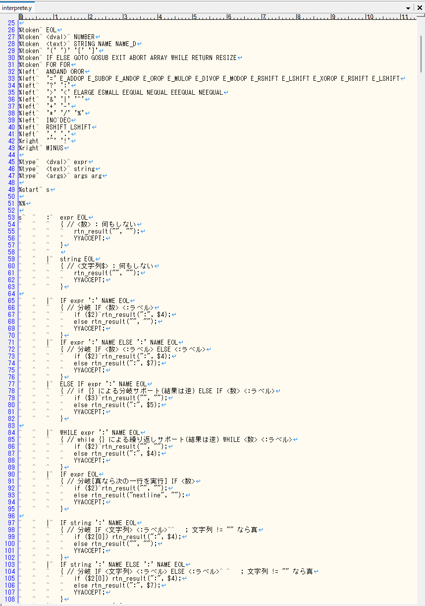 全く実現できないことを色々と、広大に妄想をしてみることがあります。 「NEOBRASTER」や「御神楽」「巫女ブラスター」をスマホゲームにしてみたいとか。 NumLockLock、マウスふるふる、マウスのお供などのタスクバーの通知領域(タスクトレイ)常駐系のソフトを1つにまとめ、1つのアイコンから操作できるようにしたいとか。 いずれも、理論上は実現可能であり、十分な時間を確保できれば、あと需要を一切顧みなければ実現できます。 ただ、どうやってモチベーションを喚起するか、作った後のメンテナンスはどうしようか、考えれば考えるほど現実に引き戻されてしまい、作ることはないものとなります。 最近考えたのは、いじくるつくーる(Rnsf ver.7)から、R-Scriptを分離・独立させたいという妄想です。 C++からPythonを呼び出せるBoost.Pythonとか、C言語からLuaスクリプトを呼び出したりとか、まぁ、現実に存在するアイディアではあるんですが、そのうちの1つとして列挙されるようにしたい。 ソースコードはダウンロードページで公開しているので、展開してがんばれば見れる状態にはなっておりまして、lexとyaccで文法ルールを定義して式の実行・分岐・繰り返し・関数呼び出しなどを行い、関数としてC言語で用意している機能を呼び出すことで、様々な機能(レジストリの読み書き、ダイアログの構成等)を実行するという構成になっています。 ![]() ▲R-Script(いじくるつくーる)の文法定義(yacc) 文法定義は、こういうやつですね。 func : symbol '(' args ')' 略 args : arg ',' args 略 | arg | (なし) arg :数 略 :文字列 略 『関数とは、「シンボル(引数群)」であり、「引数群とは引数,引数群」であり、引数群は空もあり得て…』みたいなのを延々と書き並べるのが、コンピュータ言語における文法定義になります。 これはkmyaccというMS-DOS時代のプログラムでコンパイルしているので、16bitプログラムを呼び出せなくなった現代のWindowsではコンパイルすることができません。 過去の32bit時代のWindowsを仮想環境で実行して呼び出すとか、Windows用のyacc(あるいはbison)を持ってきて対応させるとかしないといけないです。 プリインタプリトと文法まわりを解決した後は、関数として用意する各機能の準備、ダイアログ制御(編集ボックス・リストビュー等の中身を追加・削除するなど)。こっちは比較的持ってきやすいかもしれないですが、現行のプログラムはUnicode対応していないので、Unicode用に作り直すのがツラそう。まぁ、変数・配列管理、ファイル操作・テキスト操作・文法拡張のための関数だけ連れてきて、ダイアログ制御やレジストリ操作の機能は連れてこないという選択肢もありか。 まぁなかなか、現在これをやるには敷居が高そうだなぁ、そもそも需要もないだろうしなぁ、時間も確保できないなぁ…。 需要はなくもないか。改行コード変換による文字列置換のルール記述にスクリプトを使えるようにするとか、マウスふるふるのマウスの動きの定義方法にスクリプトを使えるようにするとか、NumLockLockで制御対象にするアプリの選別にスクリプトを使えるようにするとか、マウスのお供でマウスのそばに表示する文字列の作成にスクリプトを使えるようにするとか、使い道を思い浮かべようとすればいくらでも出てきそう。そのために、プログラムサイズがデカくなることには、目をつぶっておくことにして…。 そんな妄想です。 あ、生成AIに全部食わせたら、自動でやってくれたりしないかなぁ。 Boost.PythonとかLuaを使えばすぐに実現できますとかは言わないように…。 プログラミングで一番面白いことの1つは、車輪の再発明なので。 あ、R-Scriptって、レジストリの値型に合わせて、整数は0以上しか扱えないんだった。 言語仕様がこれだと、(マウスふるふるで)マウス(の画面上の座標の数値)を左や上に動かす準備のために変数に数字(負の数)を入れようとしただけで詰むな。やっぱりダメそうだな。 というわけで、どうせやるならば、次の事は必須事項になりそう。 ・数値型として負の整数も扱えるようにする ・Unicode対応(Win32のC++なのでUTF-16LEを扱う。サロゲートペアの扱いは後からかな。😀とかは、当初は扱えなくてもいいかな) ・スクリプト呼び出し元のC言語関数をコールバックできるようにする(マウスふるふるに、スクリプトからマウスを動かせる仕組みを提供させてコールバック関数のように呼びだせるようにする) 必須ではないけどやっておきたいこと。 ・制御(if, whileなど)も文法として扱いたい。(いじくるつくーるのR-Scriptでは、if/while/forなどは、単純な評価+GOTO文に変換するプリインタプリタを介して実行していた) ・文法解析の副作用で実行するのではなく、文法定義と実行を分離 ・↑これらを実装する中で、blockを0行以上のstatementsと文法定義し、statementsは順次実行するものとして作り直したい 消したい要素。 ・代入文を評価式にしない(ifの中で代入を使おうとしたらエラーにする。代入文の結果を他の変数に代入する使