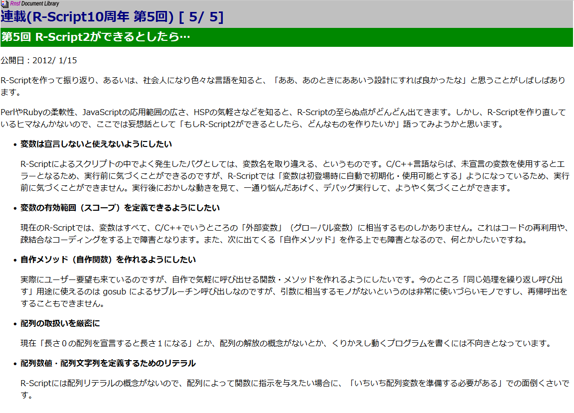 2012年1月のことですが、R-Script 10周年として「R-Script2ができるとしたら…」という記事をドキュメントライブラリ内に書いてました。 全然覚えてないや…。 ![]() 2012年1月ということは、2012年5月に発生した「連続誤検知事件」よりも前の事であり、まだフリーソフト開発にモチベーションがあった頃なためか、前向きなことを書いてますね。懐かしいです。甘いは知ってても酸いは知らない頃です。初々しいです。 現在は…………連続誤検知対応って趣味の範疇だっけ?→趣味ってなんだっけ?→趣味って生活の足しになるんだっけ?→フリーソフト開発と公開、それって生活の足しになるんだっけ?とかいう、見なくても良かったはずの余計な現実を思い出してしまったせいで、魔法が切れたかのようにモチベーションが失われているわけですが。。。2012年1月は、若い時にエンジン全開で走り出した惰性が効いていた最後の頃です。無理やりブレーキを掛けられ、いったん停止してしまうと、そこから再び走りだすことができなくなる現象。何か名前はついていないかな? さて、現在、主に「マウスふるふる」(mousefr)向けに、FR-Scriptという、R-Script2みたいなスクリプト言語を構築中なわけですが、すっかり忘れた状態で作っていたので、今から振り返ってどうだかを、1つずつ見てみたいと思います。
